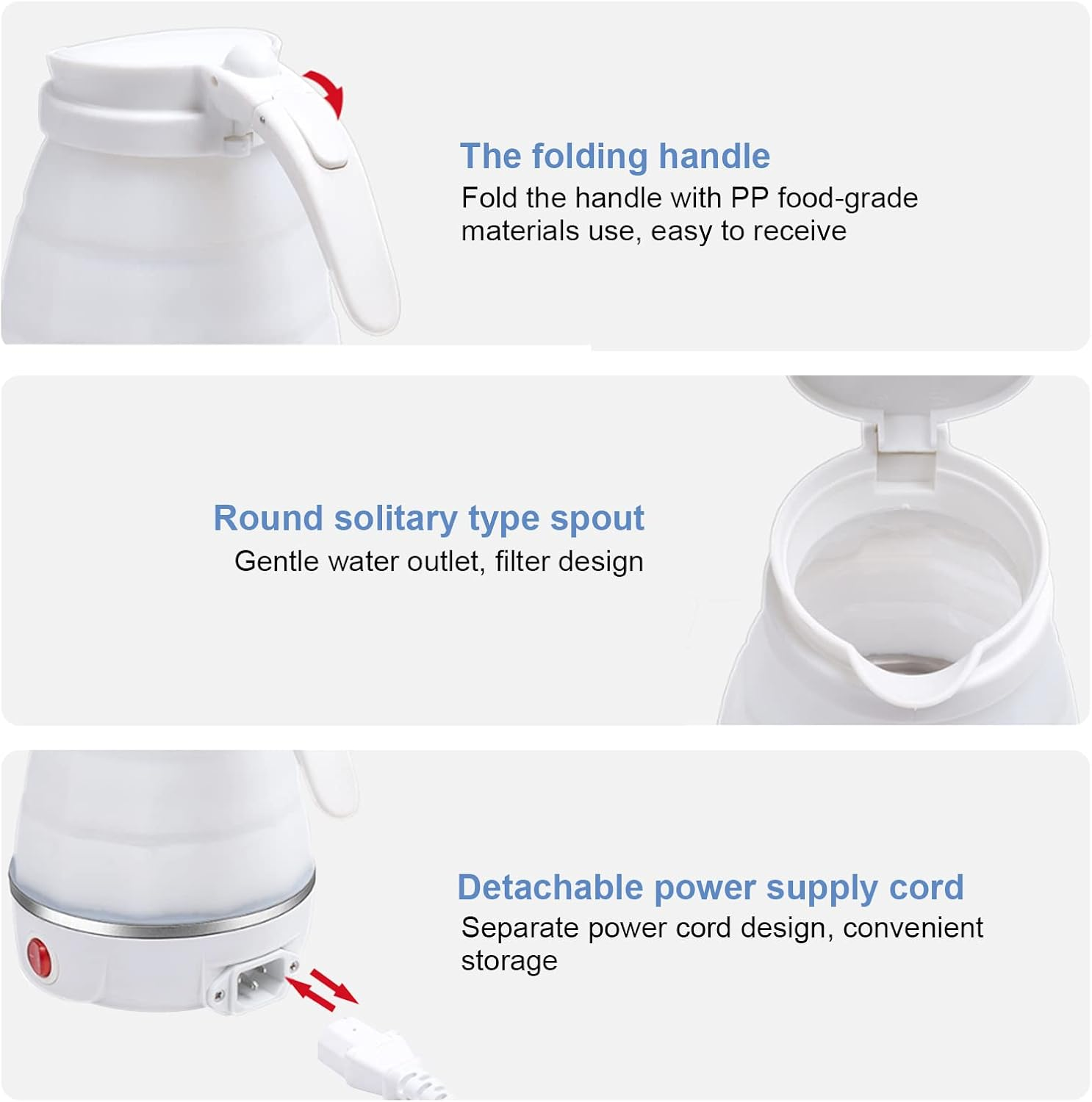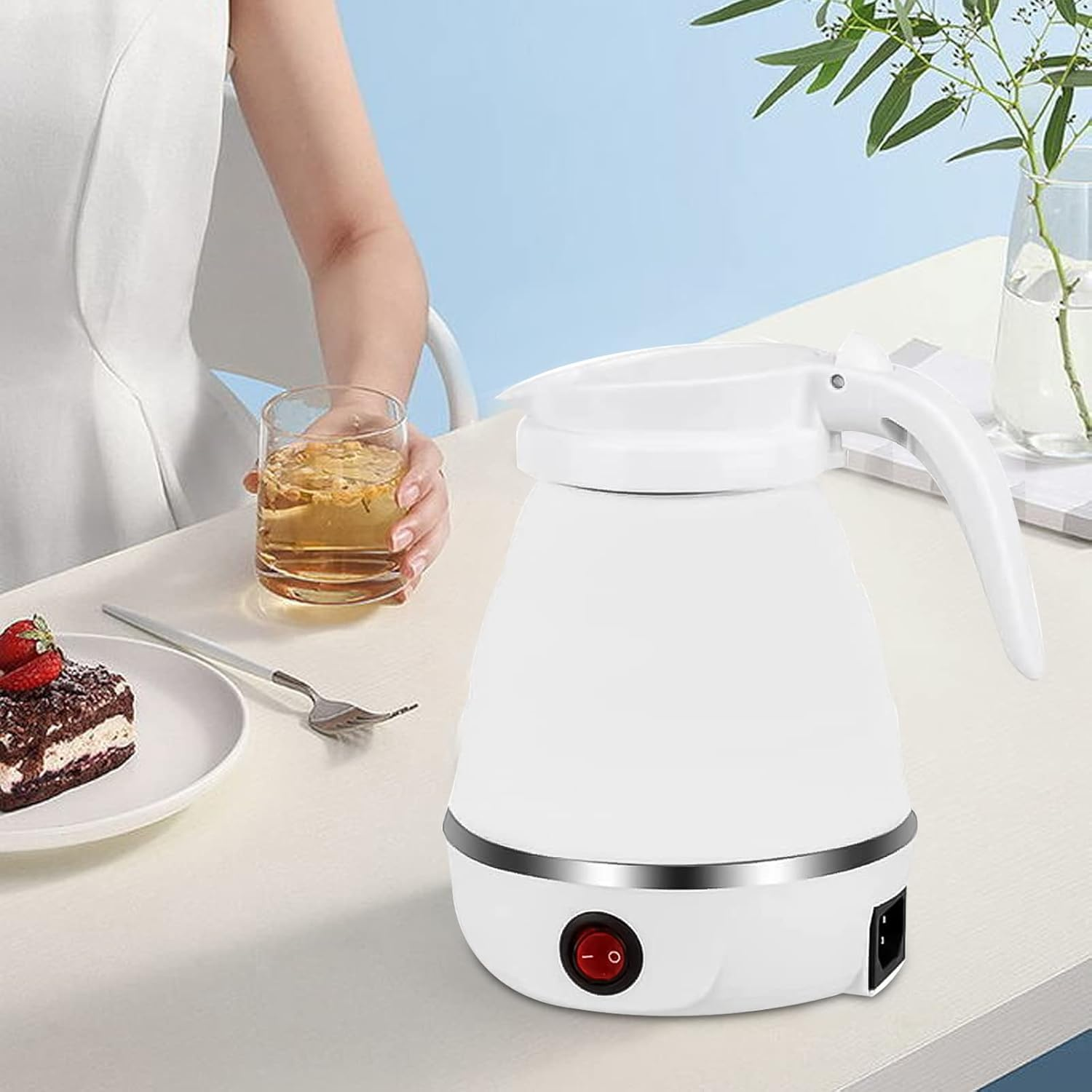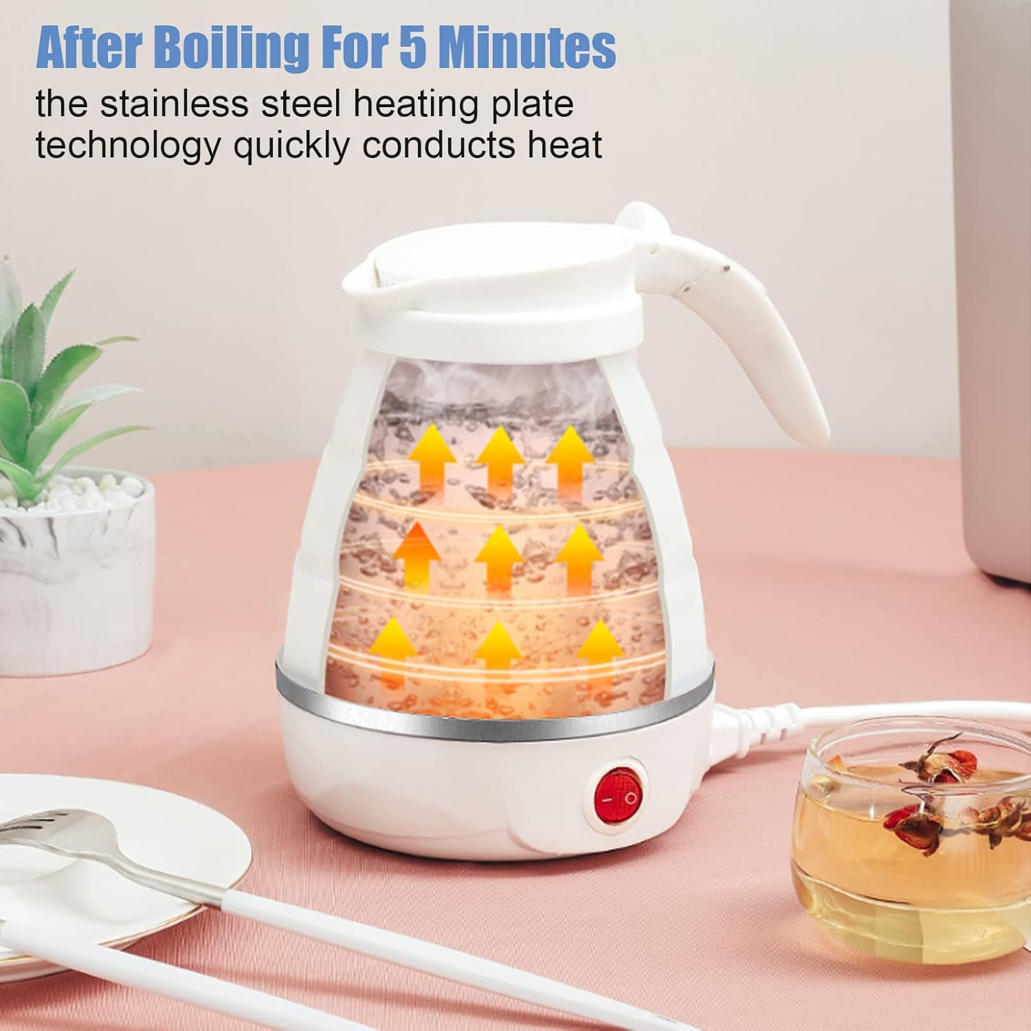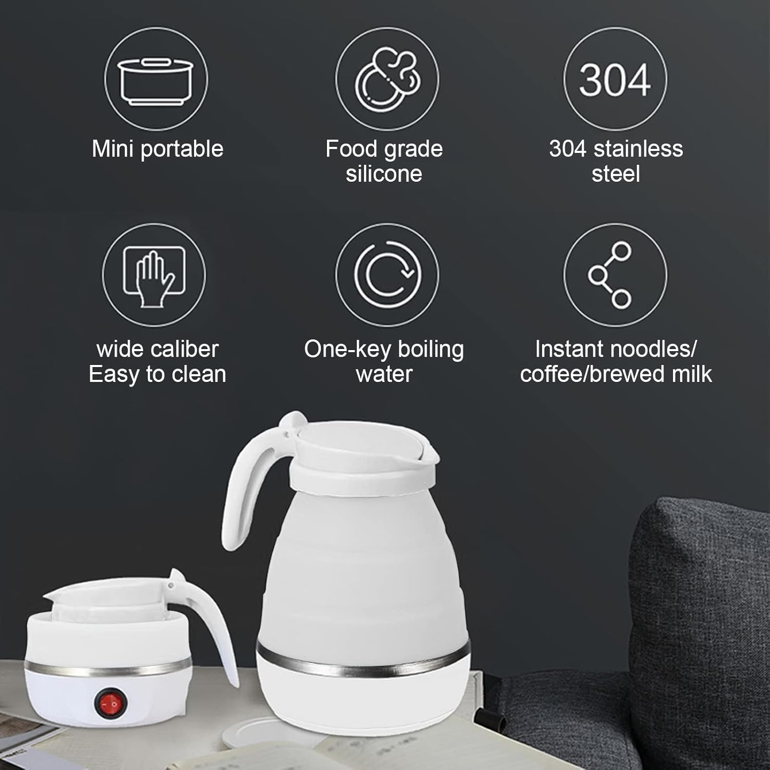 【مواد عالية الجودة】الغلاية مصنوعة من السيليكون الآمن غذائياً، خالي من البيسفينول، مع قاعدة فولاذية ومقبض بلاستيكي مطوي. غير سامة، عديمة الطعم، ومقاومة لدرجات الحرارة العالية.