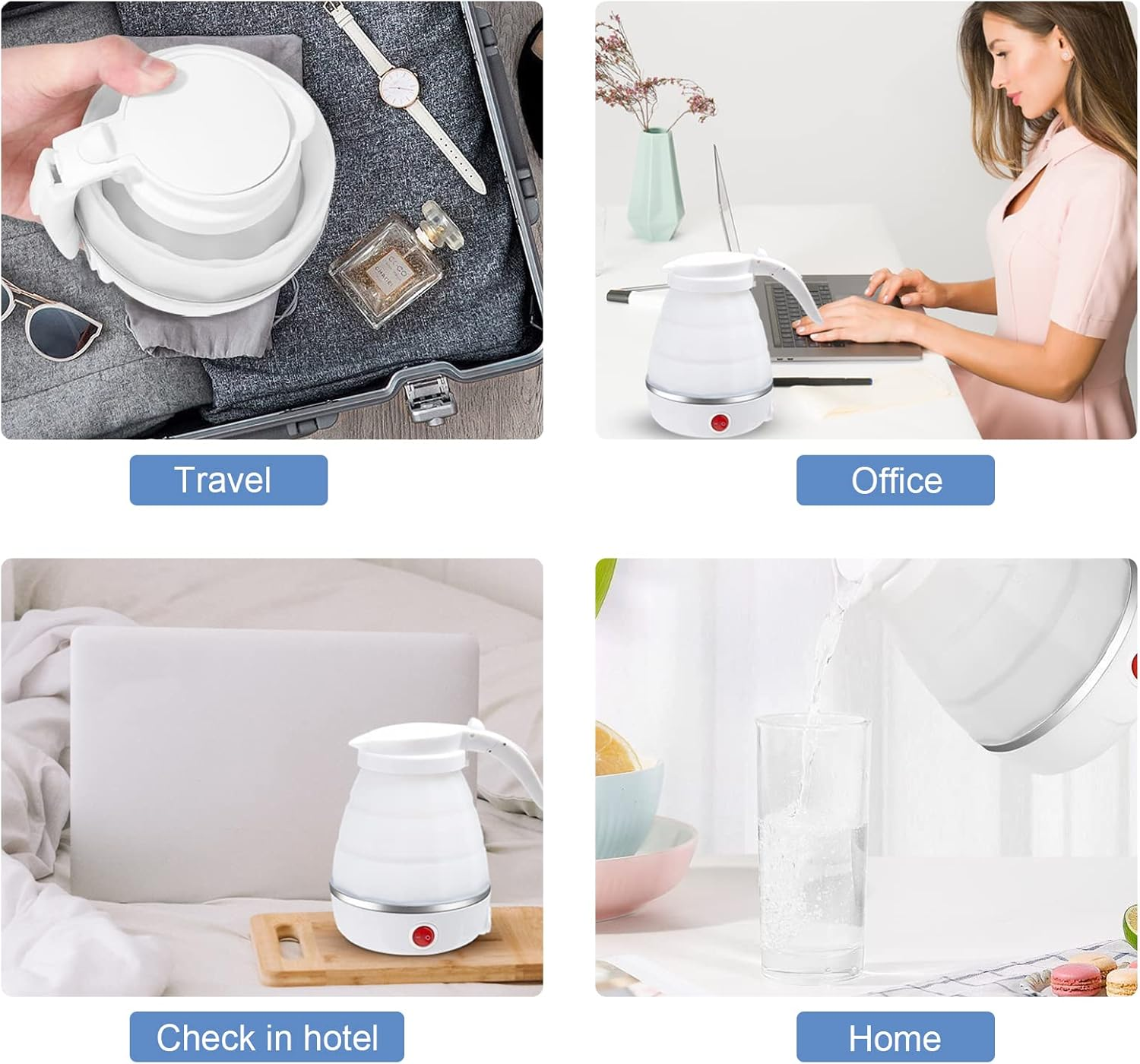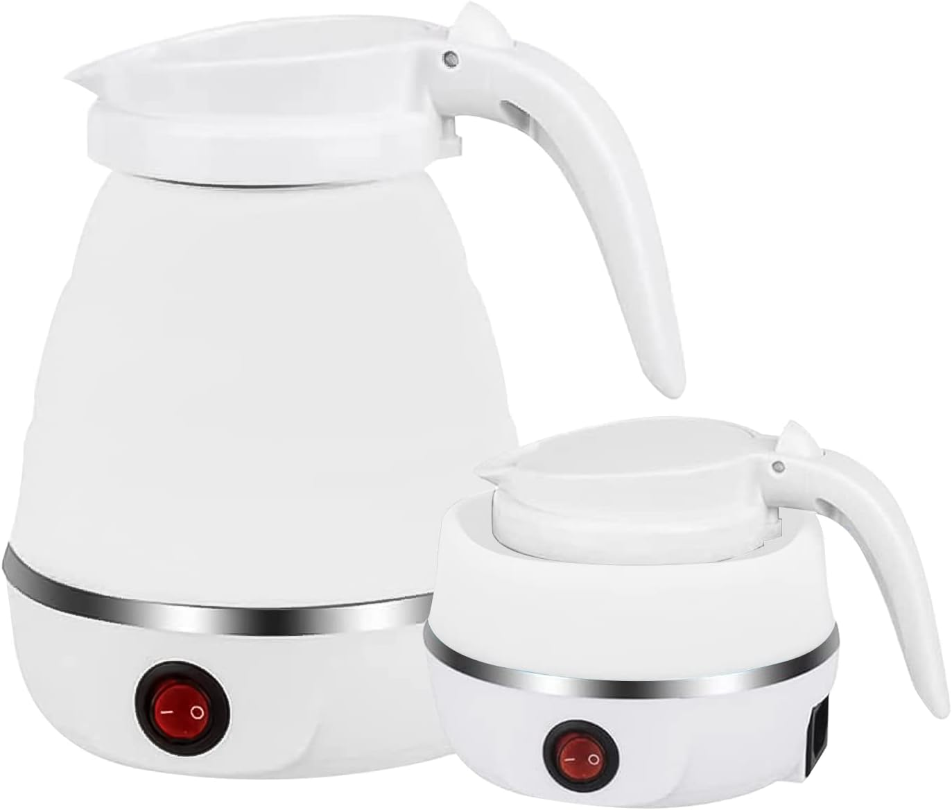 غلاية كهربائية قابلة للطي، محمولة بالألوان الأبيض/الأزرق/الوردي، سعة 600 مل من السيليكون الآمن غذائياً، مناسبة للتخييم والنزهات في الداخل (أبيض).