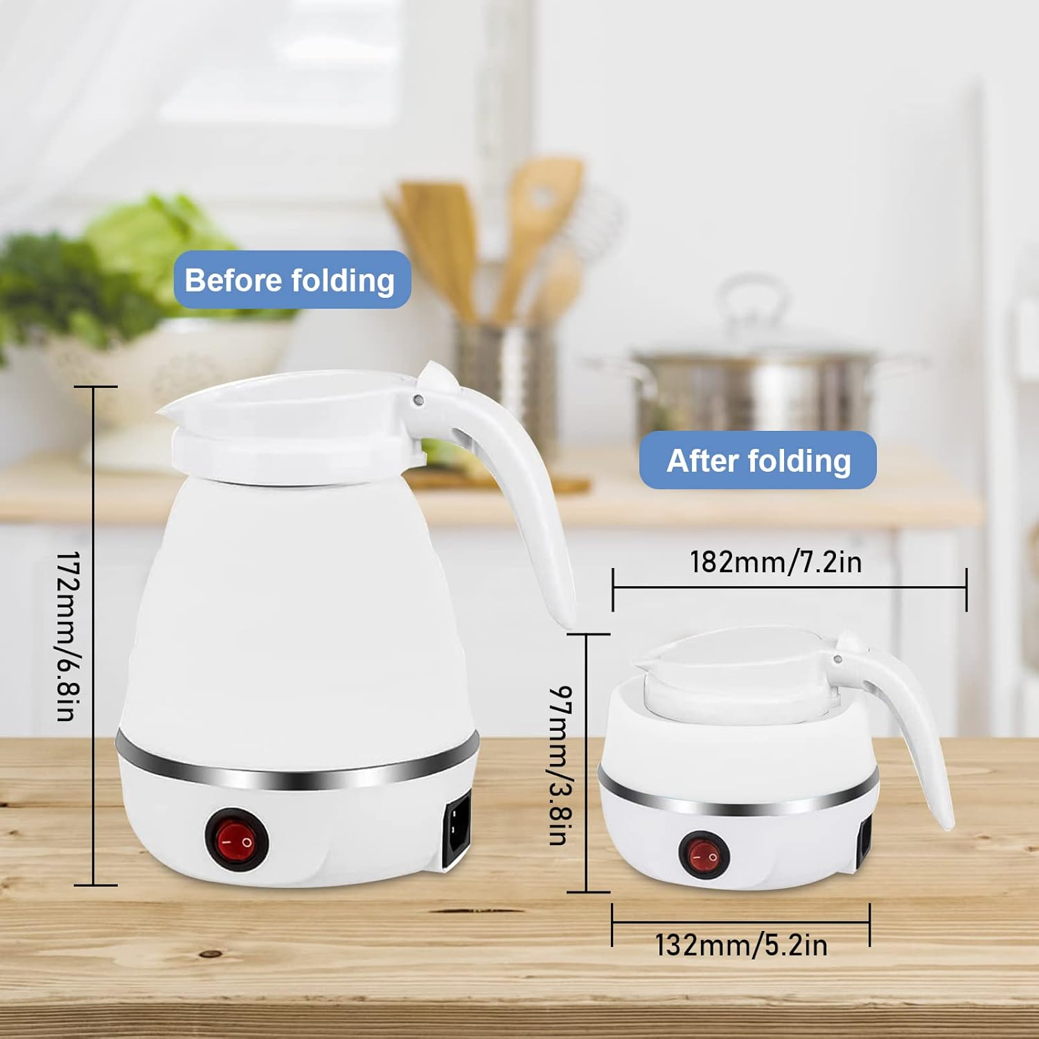 【سهلة الحمل】السعة 600 مل والوزن 600 جرام، بعد الطي تكون 9.8 سم، وبفتحها 17.3 سم. غلاية خفيفة ومريحة للسفر، توفر مساحة كبيرة عند التعبئة.