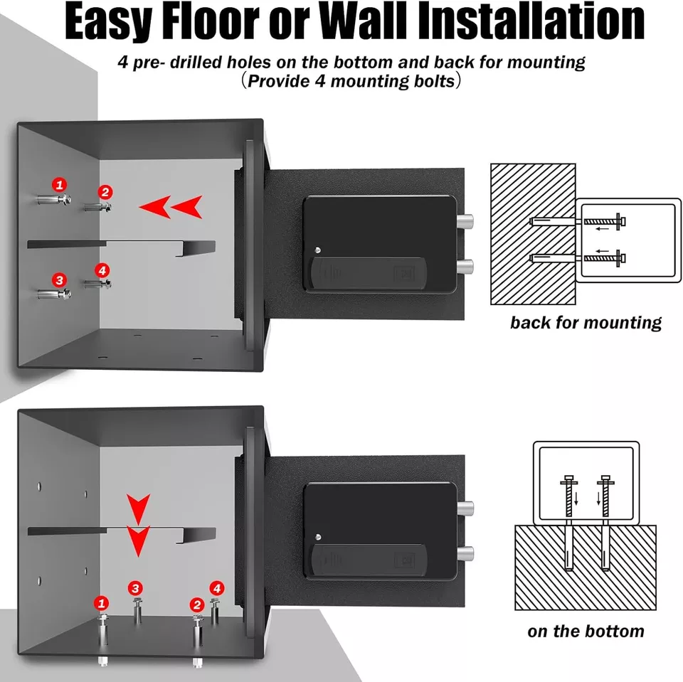【تركيب على الجدار أو الأرض】هذه الخزنة تحتوي على ثقوب تثبيت مسبقة في الخلف والأسفل، لذا يمكن تثبيتها على الجدار أو الأرض. نقدم 4 براغي توسعة للتثبيت.