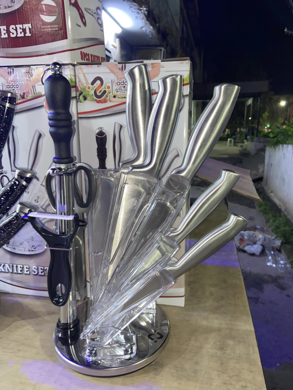 حامل دوار قابل للطي بزاوية 360° مع سكاكين متنوعة: سكين شيف (29 سم)، سكين خبز (33 سم)، سكين عالمية (24 سم)، سكين تقشير (22 سم)، مقص 5 في 1 (18.5 سم)، ومبراة (29.5 سم).